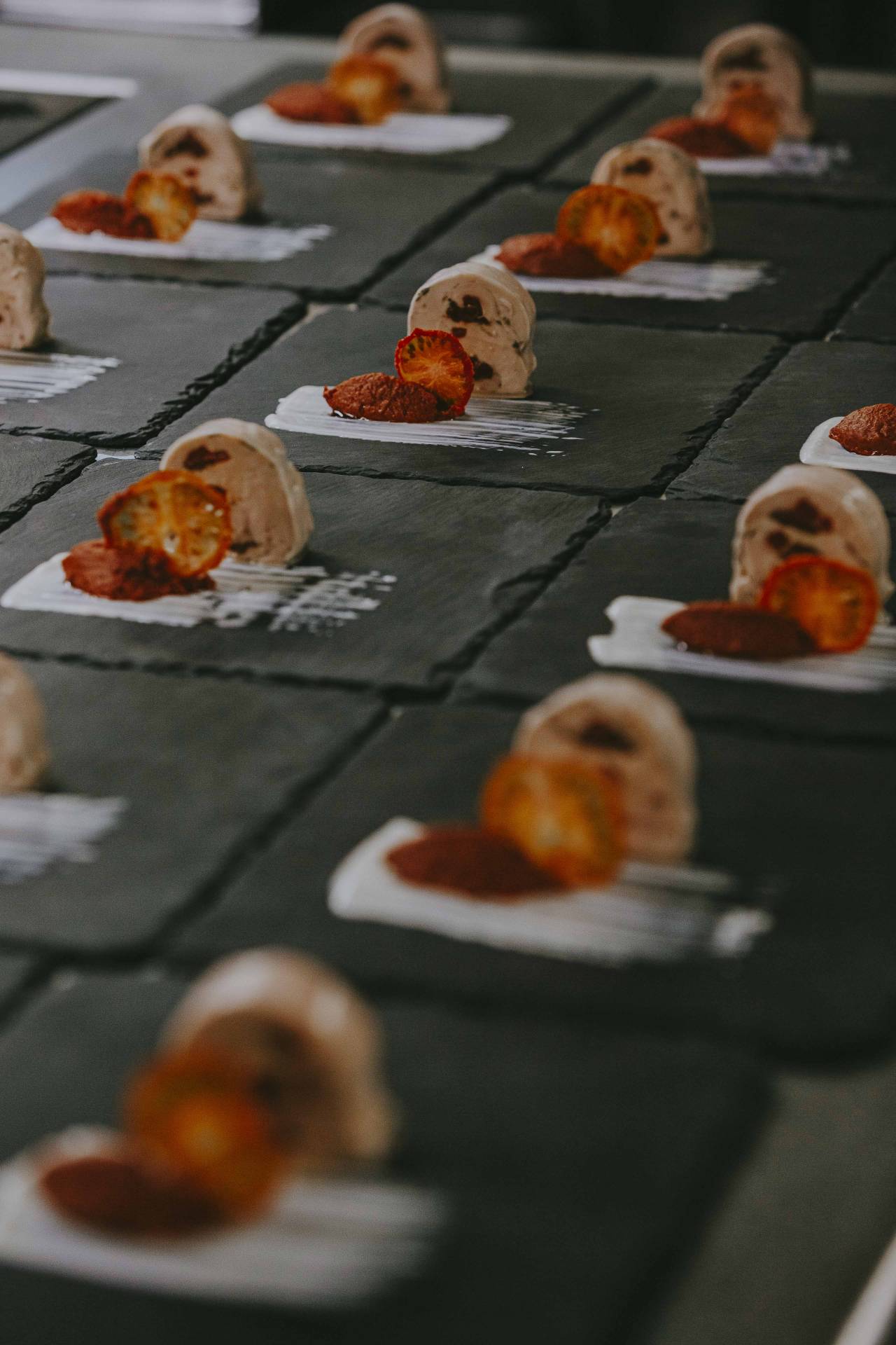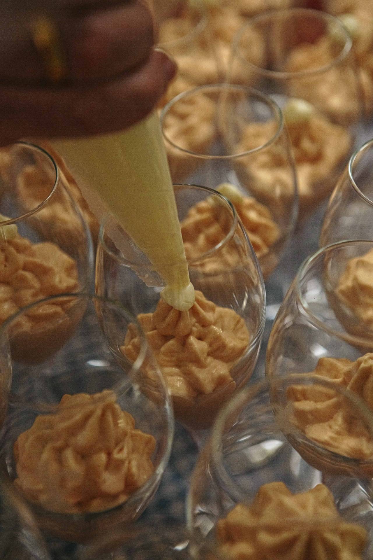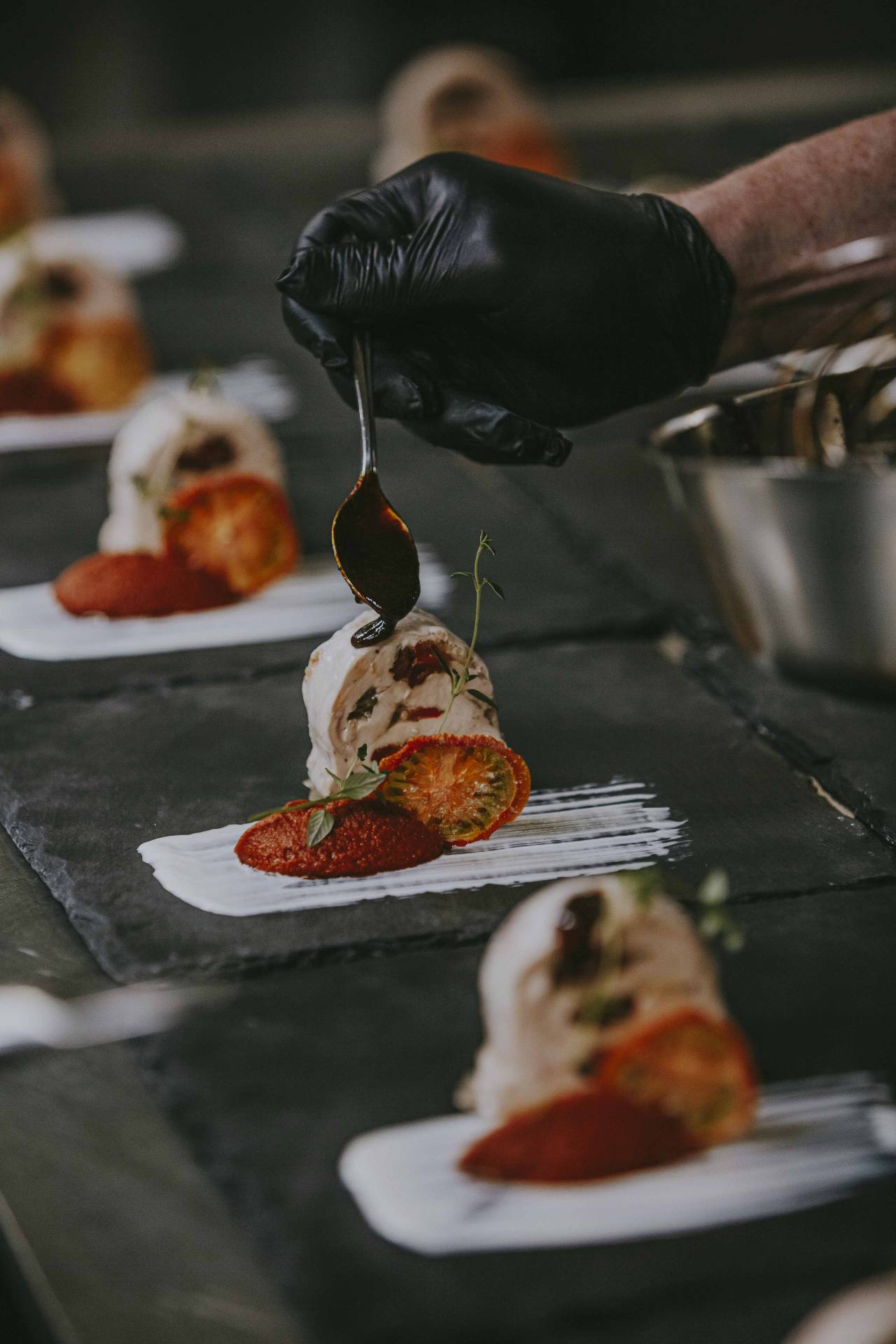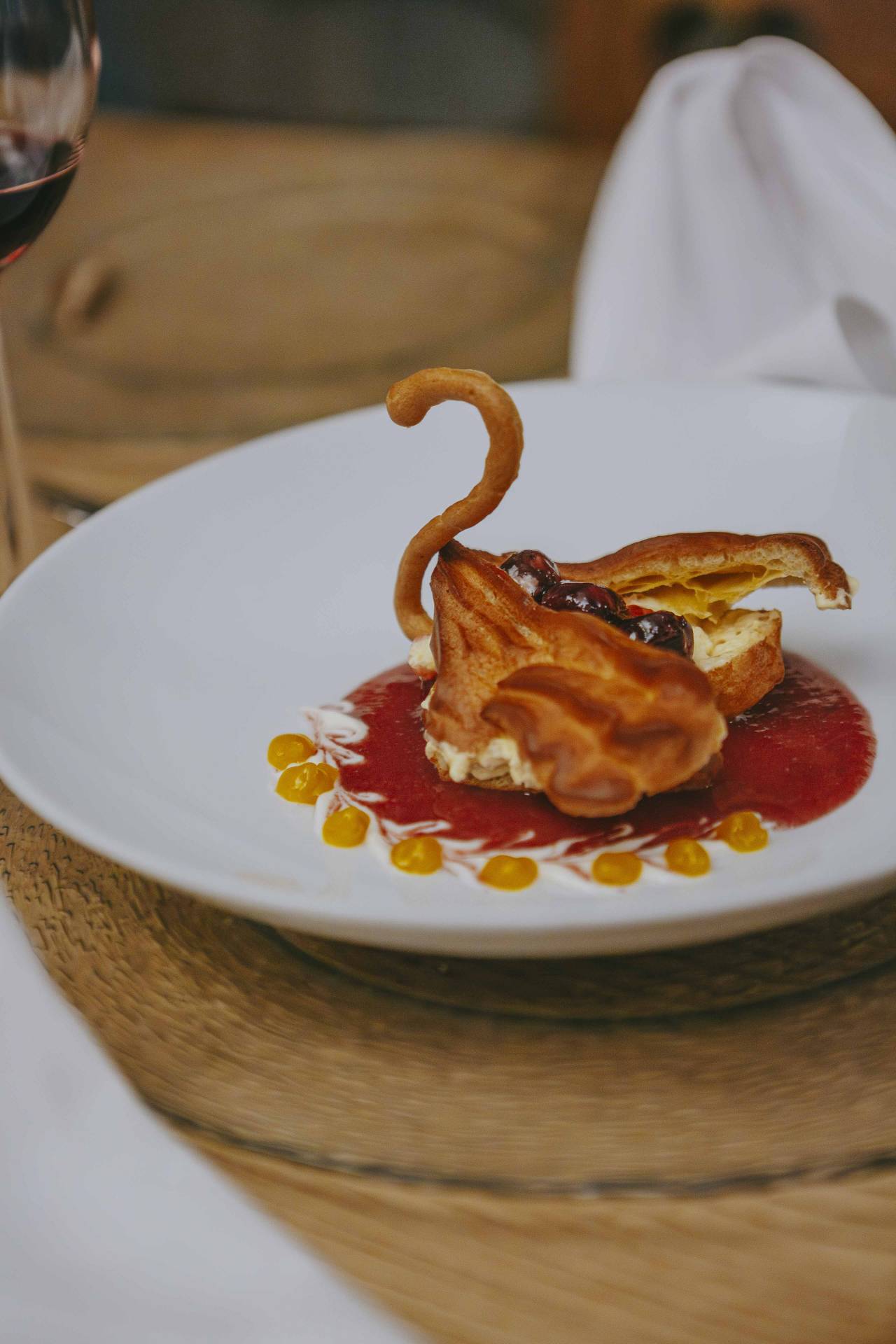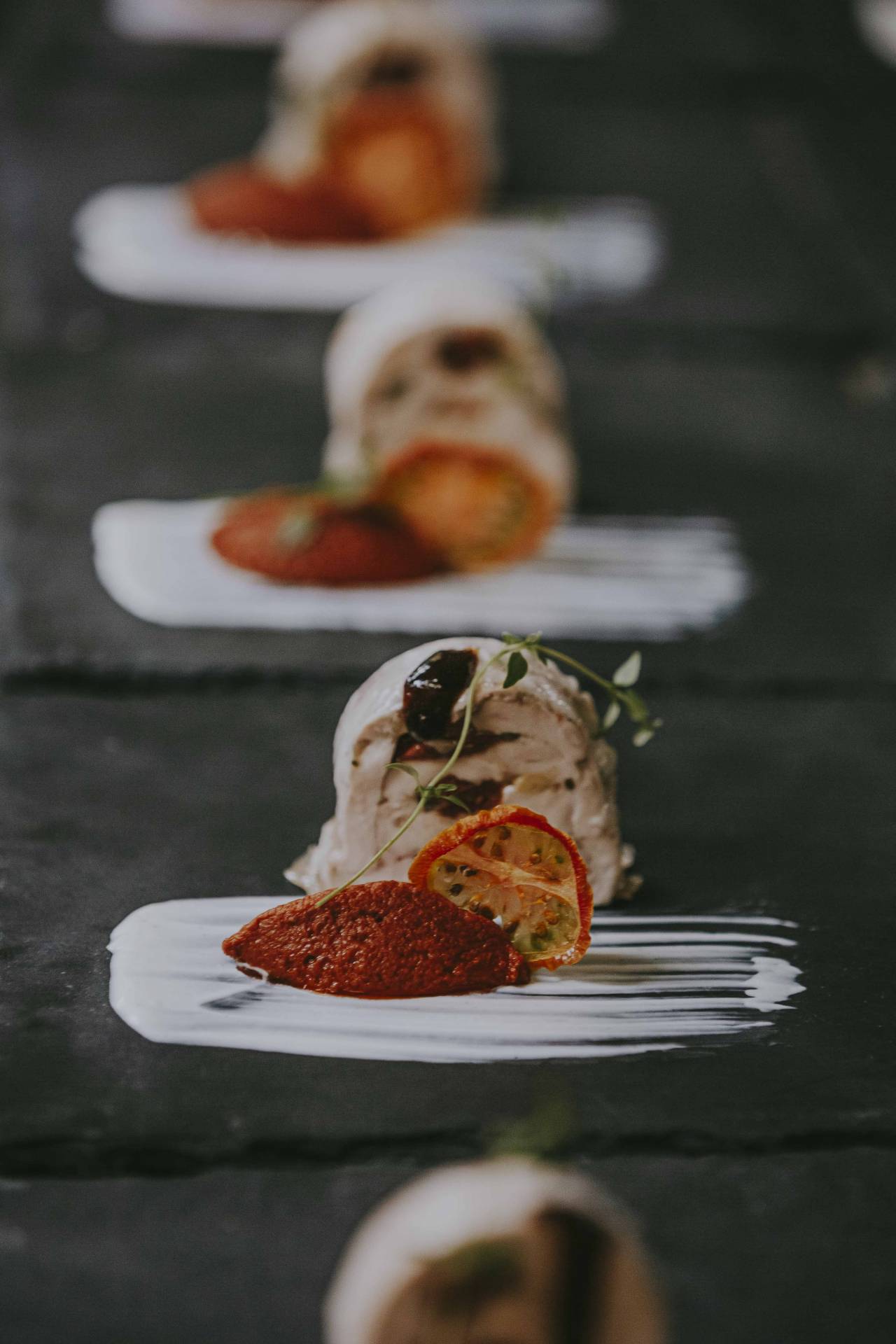 Gefüllte Auberginenröllchen mit Avocado, begleitet von einer feinen Safran-Sabayon