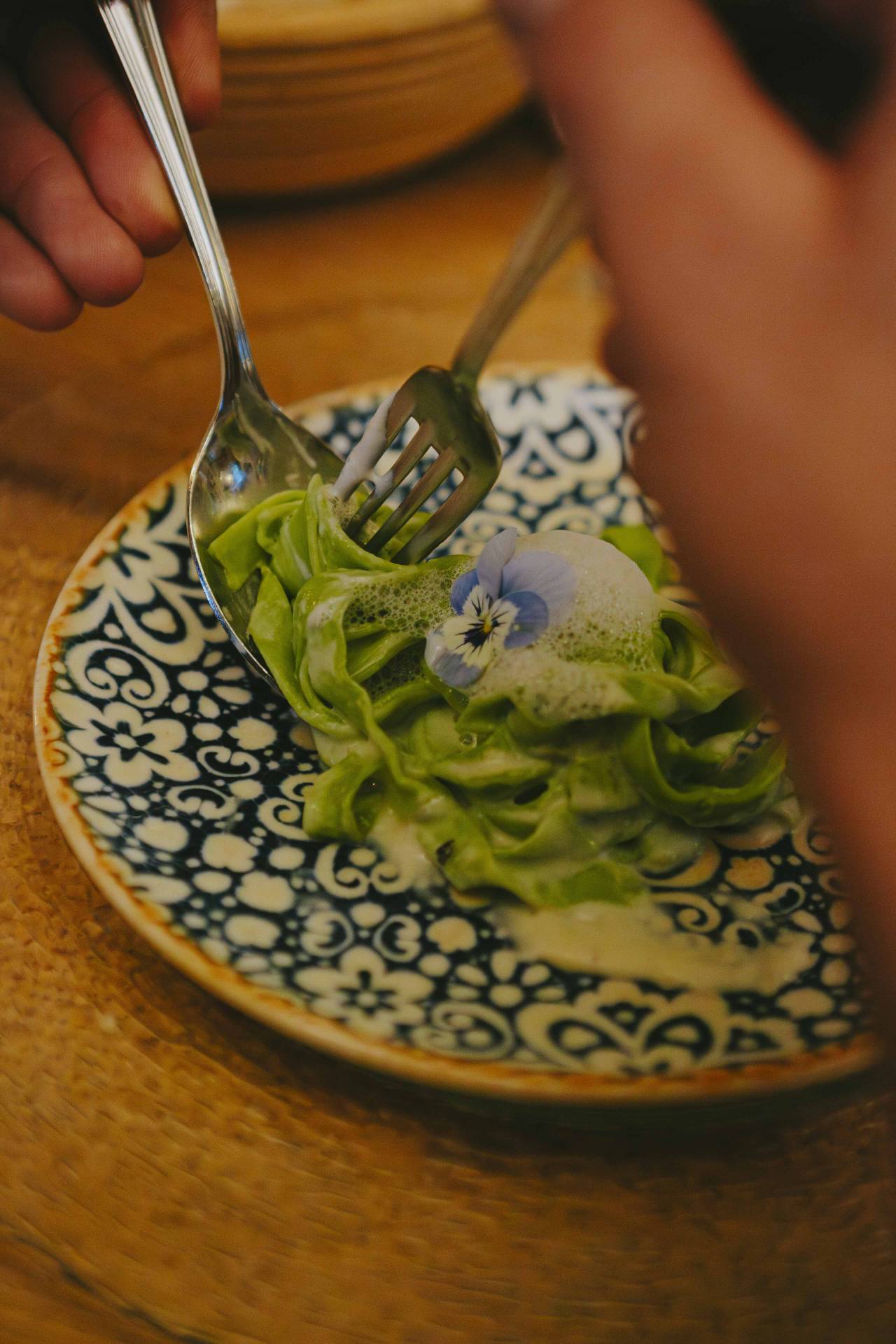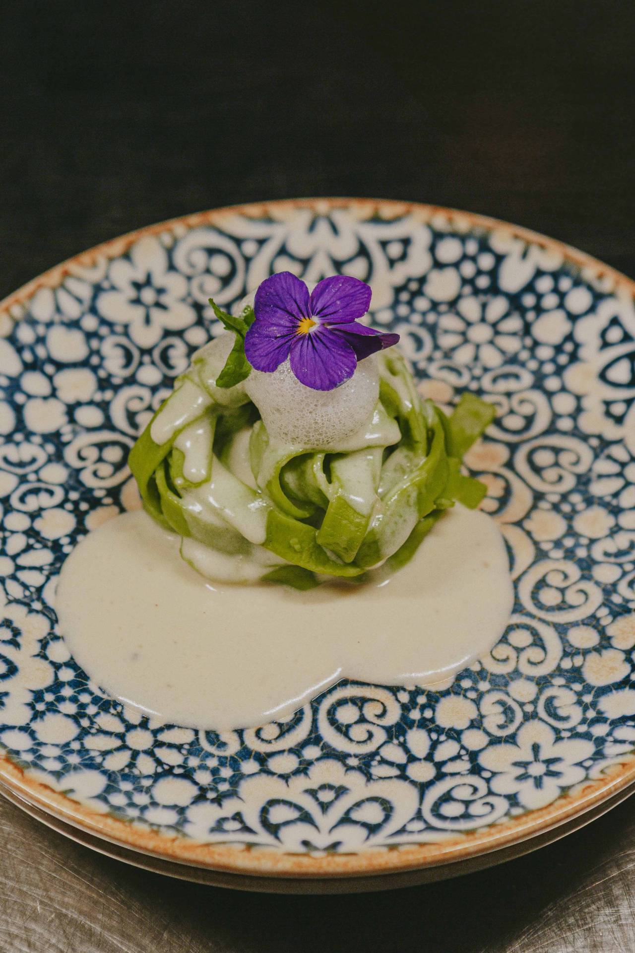 Taleggio-Maultaschen mit Zucchinichip und glasierten Zwetschgen
