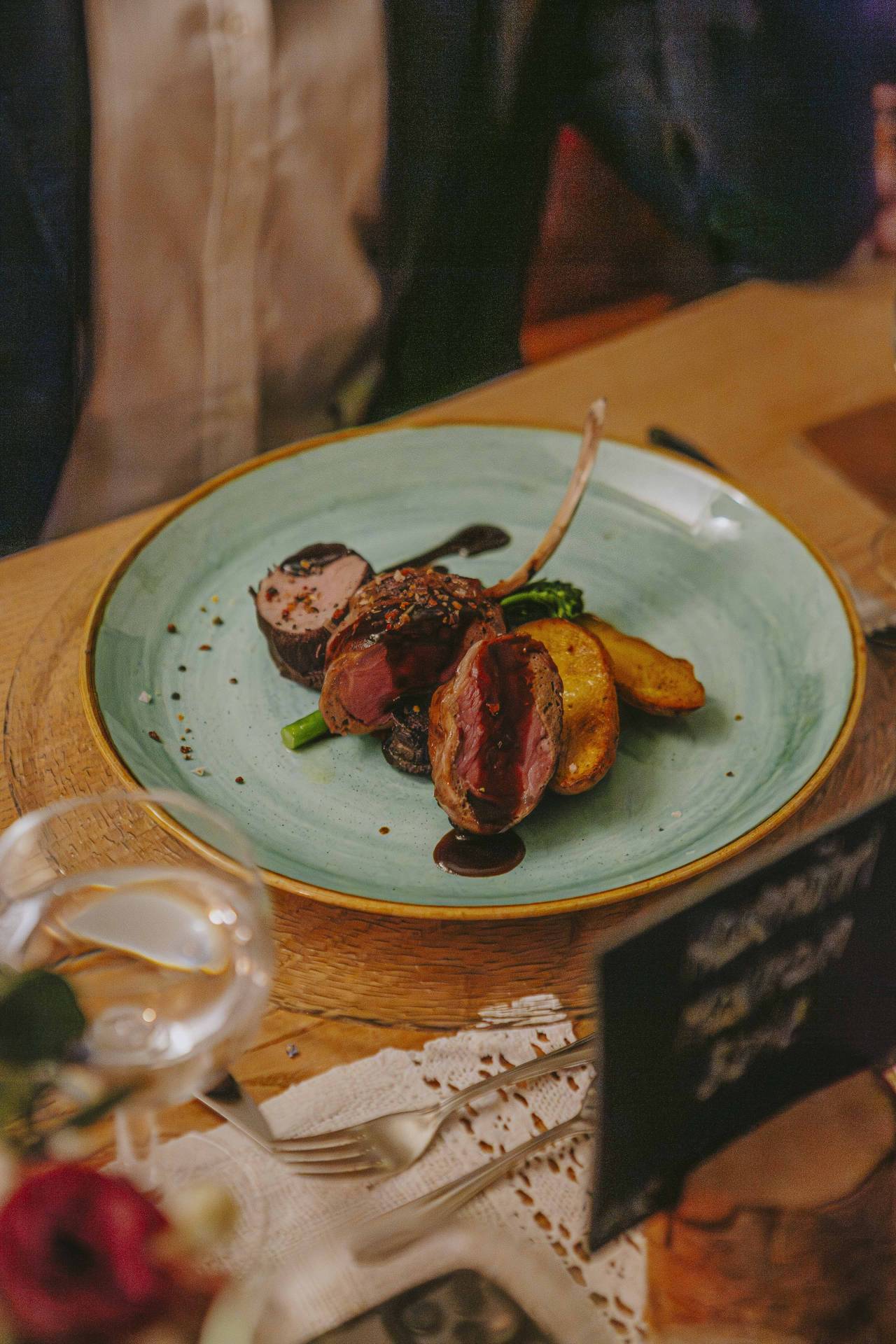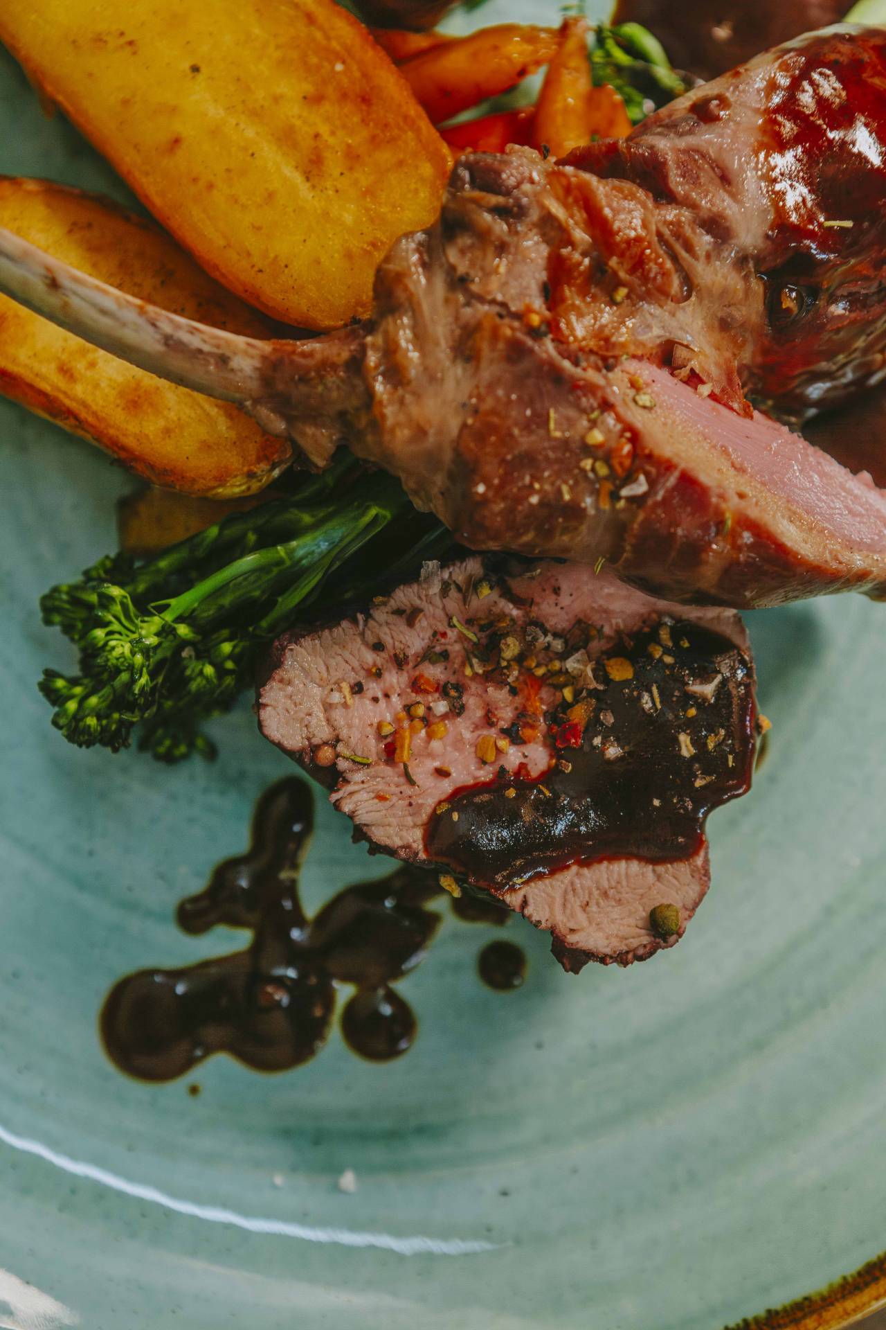Dreierlei vom Reh: rosa gebratener Rücken, Roulade und Ragout im Teigmantel – dazu sautiertes Baby-Gemüse, Perlgraupenrisotto und eine aromatische Portweinglace